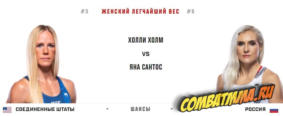 | ВЫИГРАЛ | Яна Сантос | UFC on ESPN 43 Vera vs. Sandhagen Mar / 25 / 2023 |