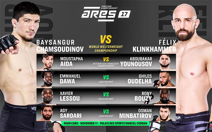 17 ноября 2023 года в Пале де Спор Марсель-Сердан в Леваллуа-Перре, Франция, в главном бою Ares FC 17: Чамсудинов против Клинкхаммера столкнутся два из самых зрелищных молодых полусредневесов в мире.