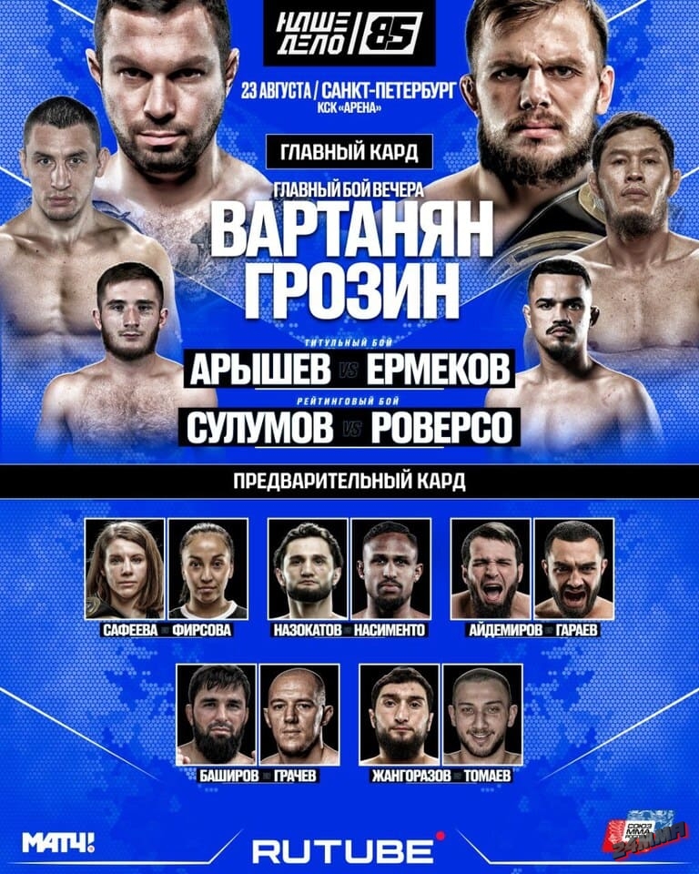 Главное событие вечера — бой в полусреднем весе между Эдуардом Вартаняном и Александром Грозиным. Вартанян, обладатель титула Гран-при АСА в легком весе, возвращается в российский промоушен после успешного выступления в К-1. Его соперник, Грозин, за последние три года продемонстрировал феноменальные результаты, выиграв 11 боев подряд, включая недавнюю победу над бывшим бойцом UFC. Этот поединок обещает стать настоящим украшением вечера.