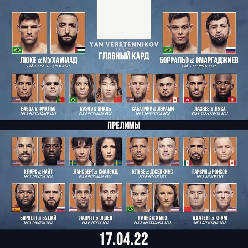 17 апреля в 00:30 мск на арене UFC Apex (Лас-Вегас) начнется турнир UFC Вегас 51: Люке vs Мухаммад. В главном бою вечера четвёртый номер рейтинга полусредней весовой категории Висенте Люке встретится с пятым в списке лучших бойцов дивизиона Белалом Мухаммадом.
